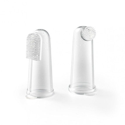 Rinkinį sudaro du pirštukiniai dantų šepetėliai, pagaminti iš minkšto silikono. Vienas švelniai valo dantis, o kitas masažuoja dantenas. Abu turi smulkius iškilimus ir minkštus šerelius. Taip pat galite naudoti patogų dėklą jiems laikyti.