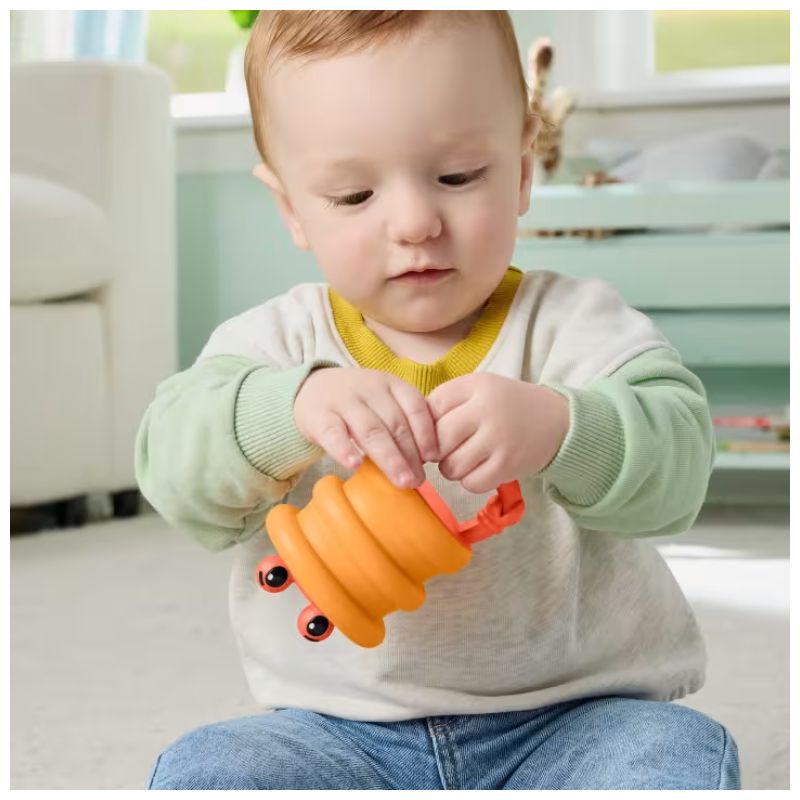 Pagamintas iš minkšto silikono, barškutis puikiai tinka dantukams dygti: jį saugu kramtyti ir lengva suimti mažoms rankytėms. Akordeono efektas, kai žaislas susispaudžia ir „spragteli“, teikia džiaugsmo jūsų kūdikiui ir skatina jo smalsumą.