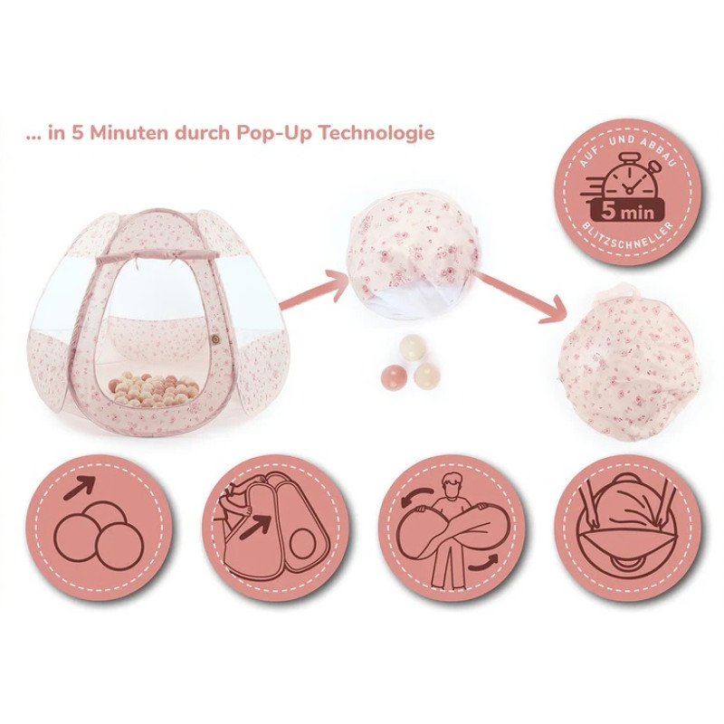 Ideali „2-in-1“ kombinacija – žaidimų palapinė ir kamuoliukų baseinas žaidimams, šėlionėms ir slėpynių žaidimams! Žaidimas su 50 kamuoliukų, įtrauktų į komplektą, lavina vaiko spalvų suvokimą ir motorinius įgūdžius. Palapinės įėjimą galima atidaryti ir uždaryti naudojant juosteles. Sulankstoma „Pop-Up“ palapinė surenkama per kelias sekundes ir kompaktiškai sulankstoma laikymui - ją galima naudoti tiek namuose, tiek lauke.