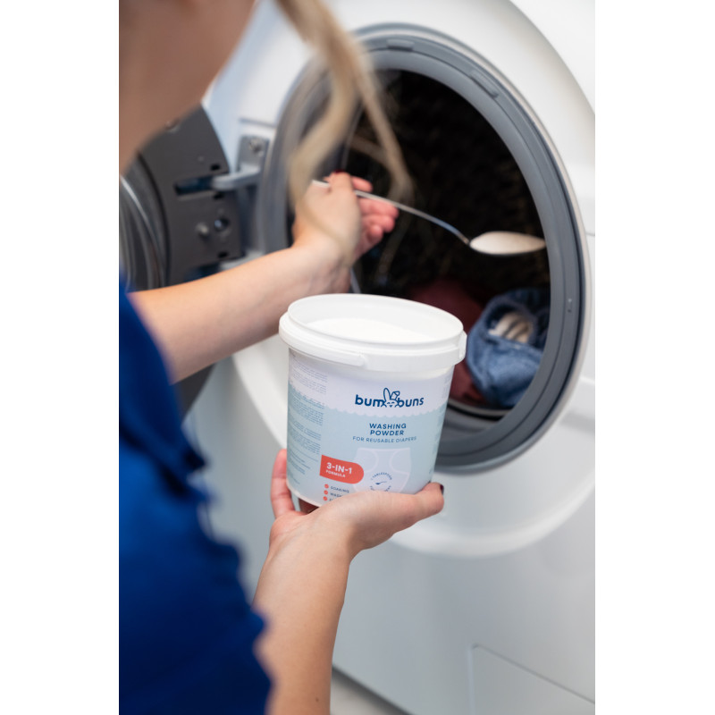 Rekomenduojama naudoti 2 šaukštus „BumBuns“ skalbimo miltelių 18-ai daugkartinio naudojimo sauskelnių ir skalbti 60 °C temperatūroje, siekiant geriausių rezultatų.