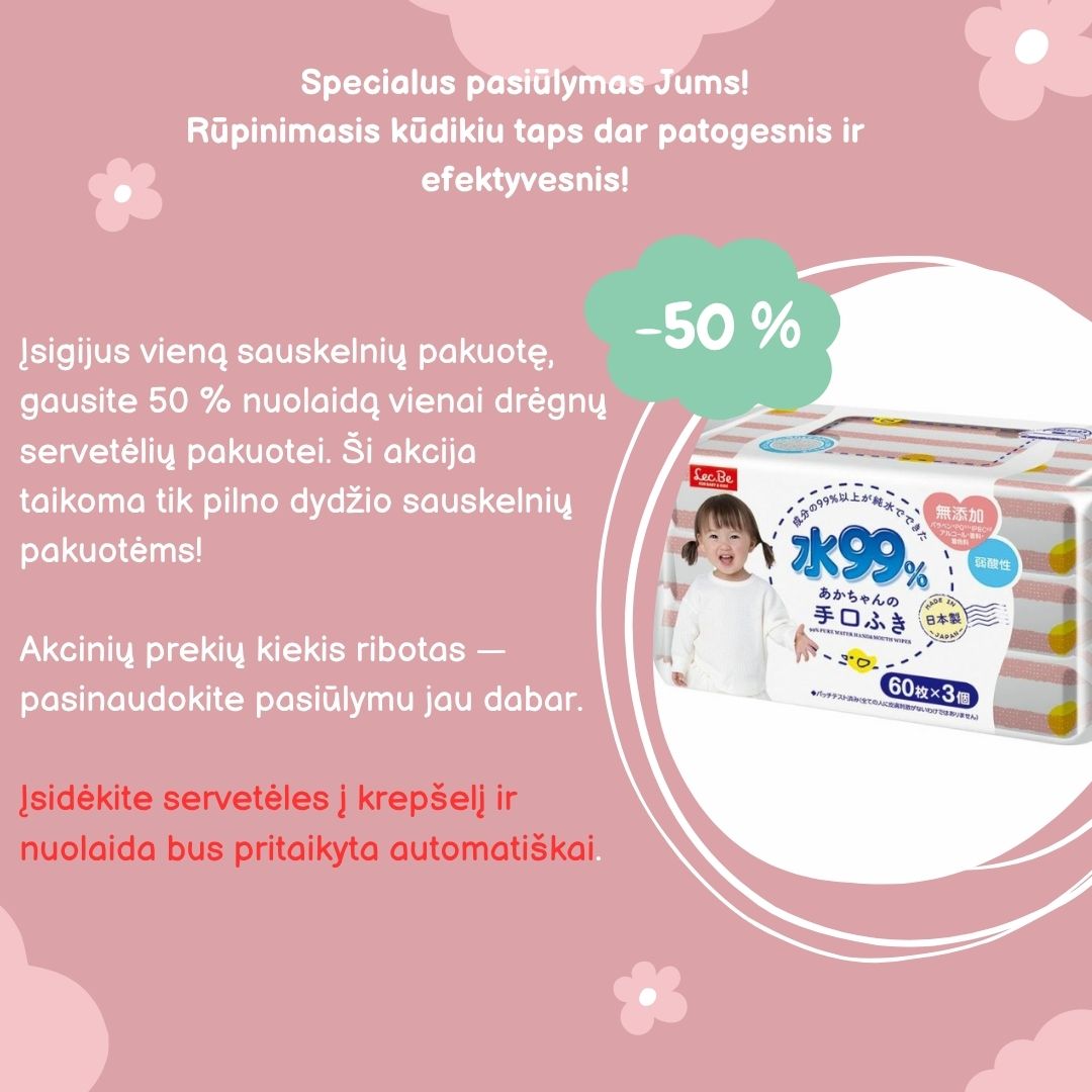 Specialus švelnus servetėlių pagrindas padeda pašalinti nešvarumus nuo kūdikio odos nepakenkiant, švelniai ir rūpėstingai, jos nebraižant ir netrinant, ypač tinka sričiai aplink burną, lūpas, veidą, taip pat ir rankutėms. Sudėtyje yra 99% išgryninto vandens.