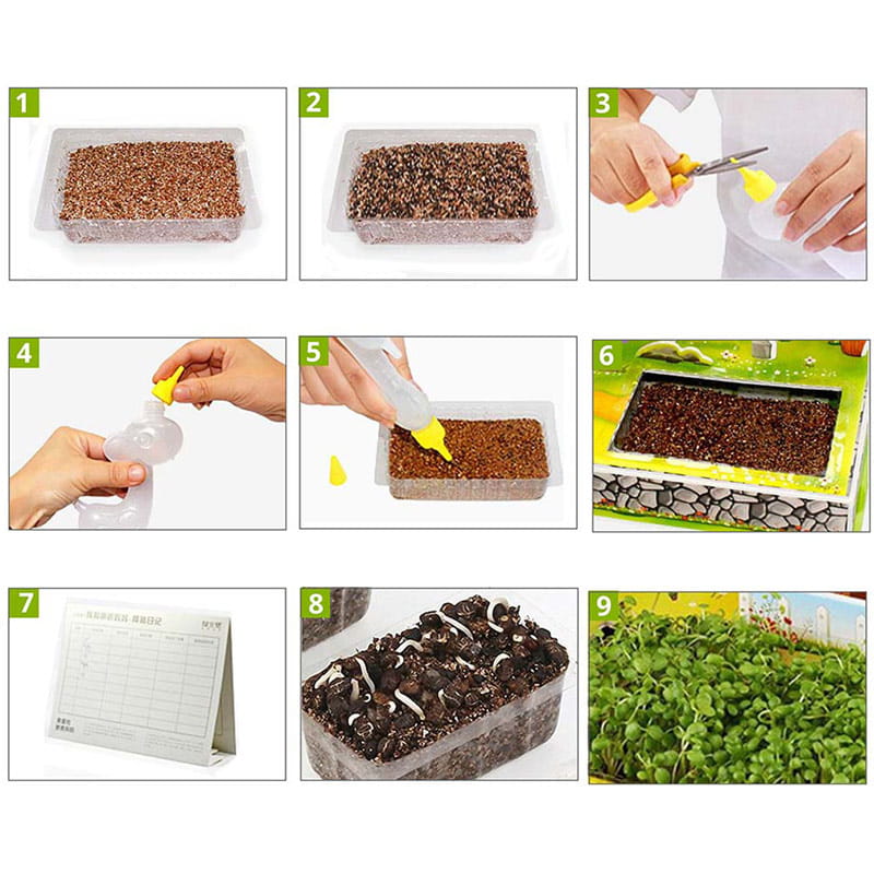 - Rinkinyje yra: detalės, užrašinė anglų kalba, plastikinis indas (2 vnt.), dirvožemis, sėklos ir mažas laistytuvas.