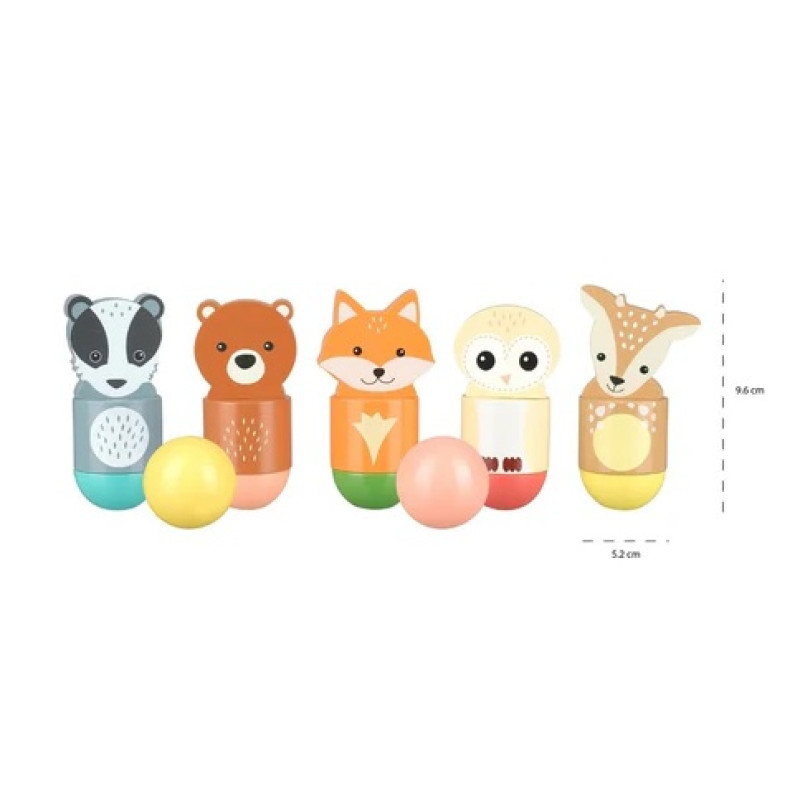 Komplekte yra 5 ryškių spalvų miško gyvūnėliai ir spalvingas medinis rutulys! Vaikai valandų valandas linksminsis, numušdami figūrėles ir vėl jas išrikiuodami!