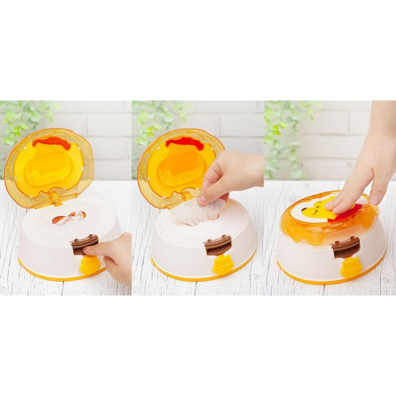 Simpatiškas drėgnų servetėlių indelis su Mikės Pūkuotuko dizainu.