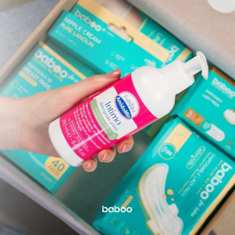 Intymiosios higienos gelis AMIDOMIO tinka kasdieniam naudojimui nėštumo metu ir po gimdymo. Šis gelis, kurio pH yra 4,5, ramina jautrią odą, skatina gijimą ir apsaugo nuo bakterijų – idealiai tinka net ir esant siūlėms.