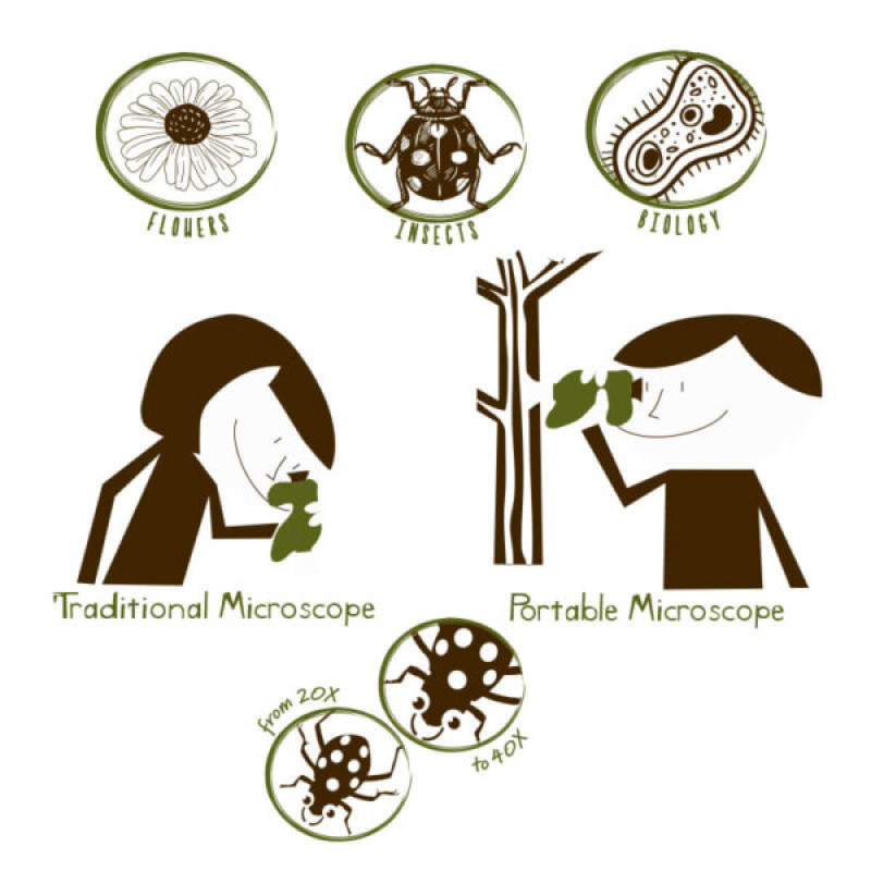 Nešiojamas mikroskopas pagamintas iš ekologiško ABS plastiko ir turi įmontuotą apšvietimą patogiam stebėjimui. Didinimas svyruoja nuo 20x iki 40x. Fokusavimas atliekamas sukant mikroskopo korpusą ant pagrindo piltuvėlio, o priartinimas reguliuojamas mažu ratuku, įkištu į objektą.