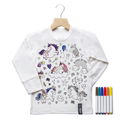 Rinkinį sudaro: 1 marškinėliai ilgomis rankovėmis, 6 flomasteriai ir linksmi spalvinimo šablonai.