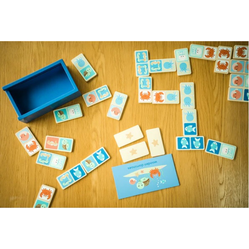 Gražus 28 medinių domino kaladėlių rinkinys su spalvingais jūros gyvūnais! Supakuoti tvirtoje medinėje dėžutėje, jie puikiai tinka žaisti namuose ar kelyje. Suderinkite draugiškus personažus ir pirmas sudėkite visus savo domino kaladėles, kad laimėtumėte!