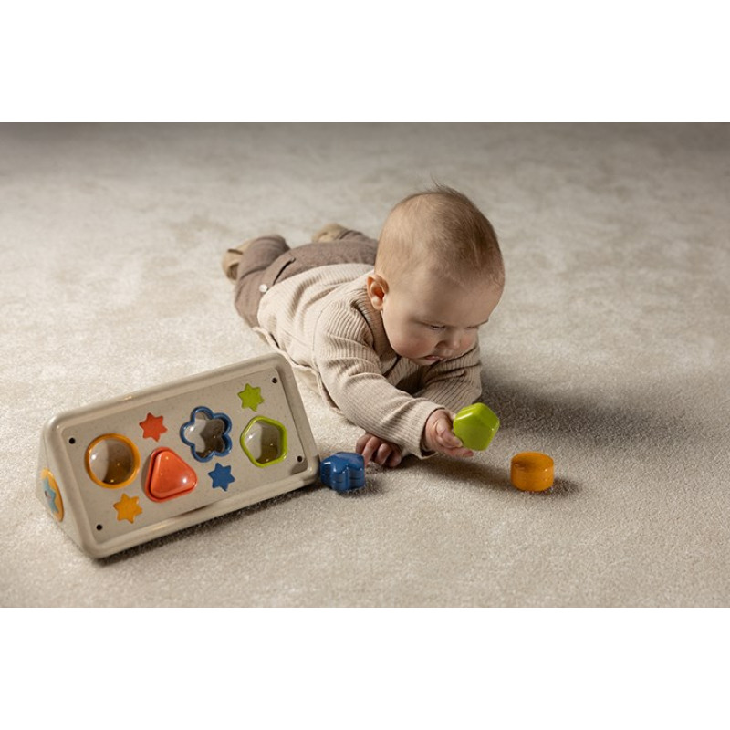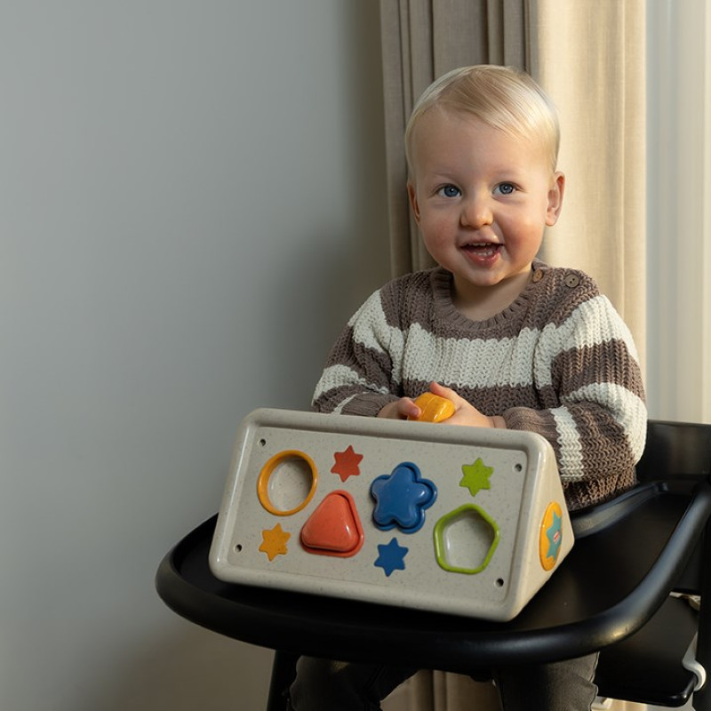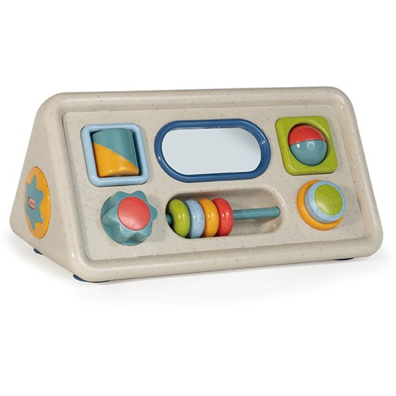 Šis dvipusis ugdomasis žaislas stimuliuoja pagrindinius vaikų pojūčius. Sukite būgnelį, pasukite spragsinčią gėlę, paspauskite švilpuką ir sukite kamuoliuką su barškučiu. Jis supažindina su skaičiavimo pagrindais, formų ir spalvų atpažinimu naudojant slankius karoliukus ir formų rūšiuoklį. Turi siurbtukus, kad būtų patogu pritvirtinti prie vaikiškos kėdės ar stalo.