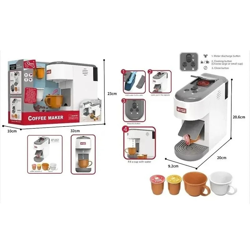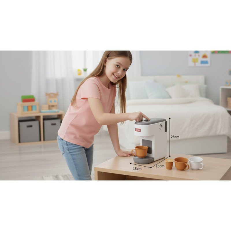 Šis žaidimų rinkinys ne tik užbaigia vaiko žaislų virtuvę, bet ir leidžia jam atidaryti savo mažą kavinę – jame yra viskas, ko reikia: kavos aparatas, kavos kapsulės ir puodeliai. Žaidimo metu kavos aparatas šviečia ryškiai, skleidžia tikroviškus garsus ir netgi pila tikrą vandenį! Žaisti su šiuo žaislu yra ne tik smagu, bet ir labai tikroviška.
