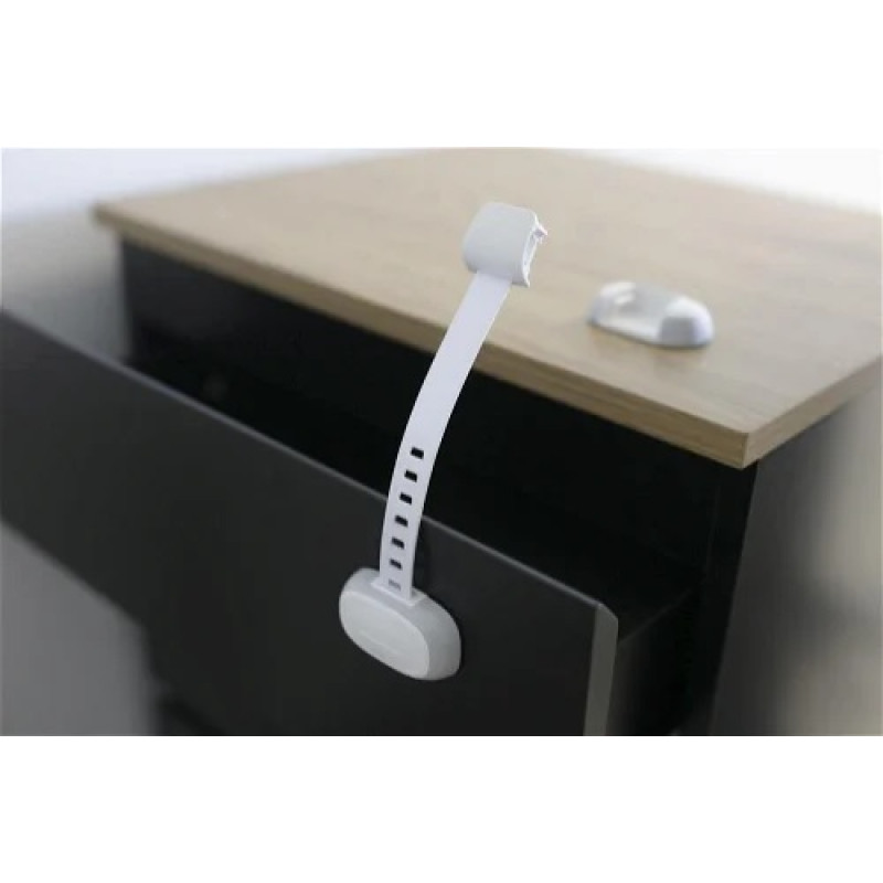 Universali spyna gali būti montuojama ant šaldytuvų, spintelių, tualetų, stalčių ir bet kokių baldų. Neleidžia stalčiams ir spintelėms atsidaryti. Ilgis gali būti reguliuojamas pagal poreikį. Spyna naudoja mygtuką, kurio negali paspausti vaikai. Lengvas montavimas su lipnia juosta ir atsuktuvu.
