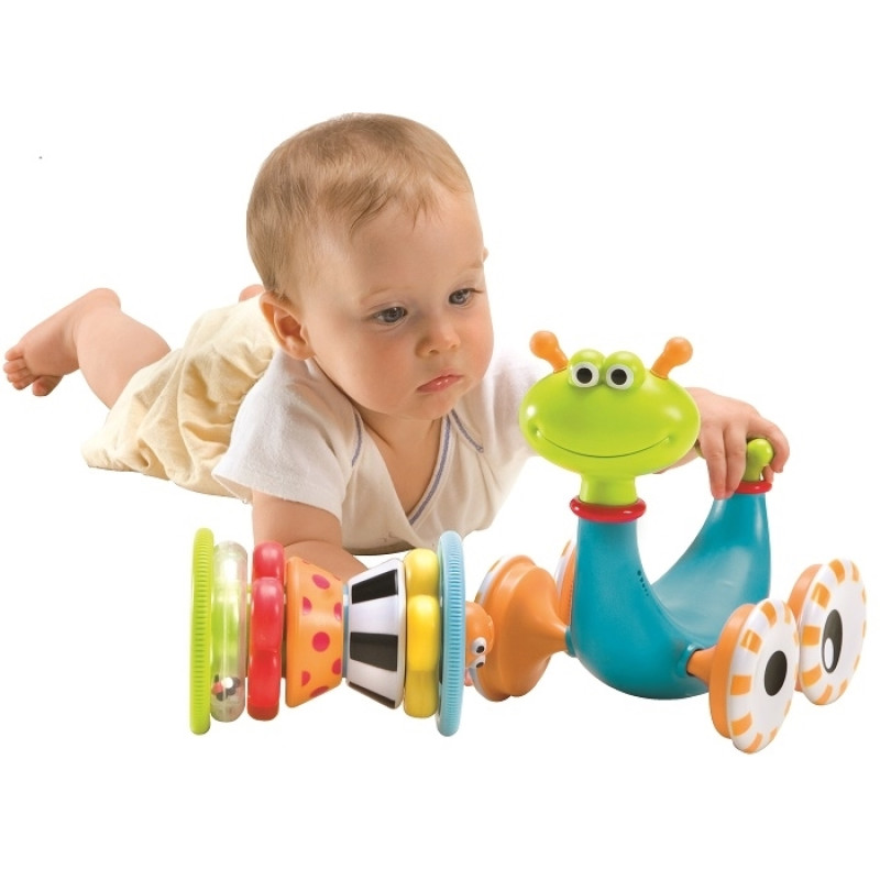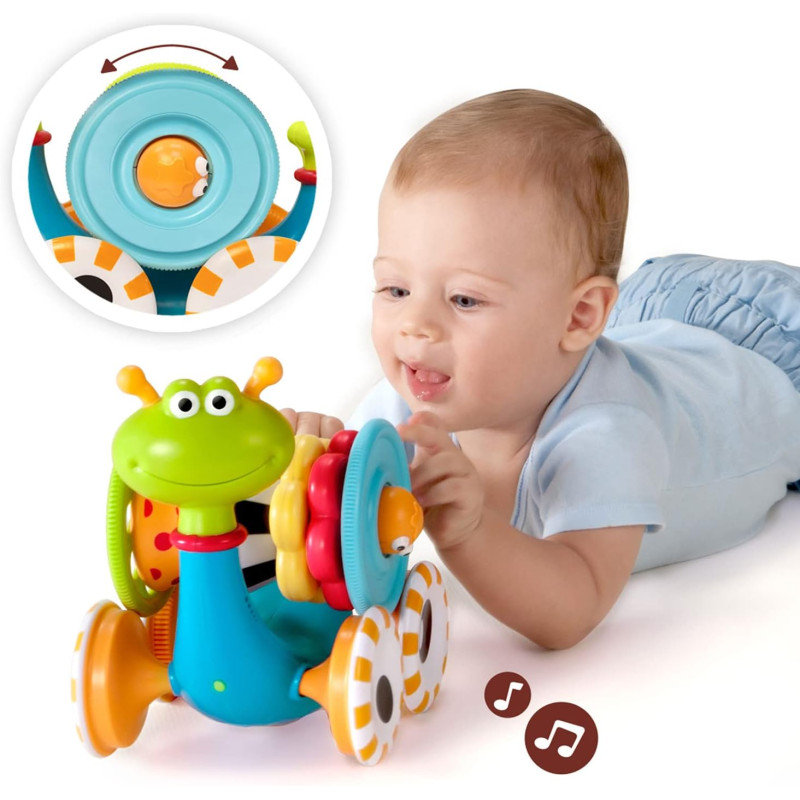 Žaislas 2 viename: vežimėlis "Sraigė" ir spalvinga piramidė, susidedanti iš 7 elementų. Spustelėkite uodegą - sraigė eis į priekį. Judėjimo metu groja linksma muzika. Paspauskite žalią mygtuką ant sraigės kaklo ir ji sustos. Piramidinis barškutis lengvai nuimamas nuo sraigės ir uždedamas atgal. Sraigės „namelis“ susideda iš kelių atskirų žaislų, iš kurių galima jį surinkti skirtinga tvarka. Juokingas snukutis-kamuoliukas, kuris iš vienos pusės išlenda iš piramidės - taigarsus cypsiukas! Su kiekvienu žaislo aktyvavimu sraigė nušliaužia iki maždaug 2 metrų atstumo, o tai skatina vaiką „ropoti“ paskui.