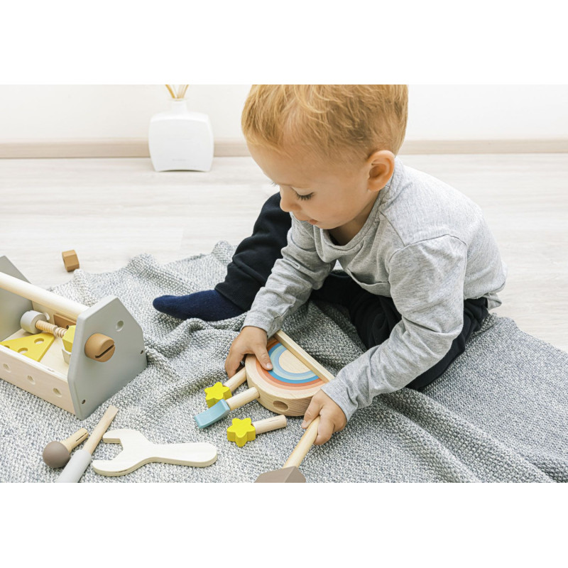 Įrankių rinkinį, skirtą gudriems mažiesiems statybininkams, sudaro plaktukas, atsuktuvas, veržliaraktis, 3 veržlės, 3 varžtai, 1 vinys, 3 medžio gabalai ir didelė dėžutė, kurioje tilps visos žaislo detalės. Žaidimo galimybės neribotos – vaikas gali kurti ir taisyti įrankių pagalba. Priemonių rinkinys lavina kūrybiškumą, motoriką, koordinaciją, rūšiavimo ir problemų sprendimo įgūdžius. Žaislas pagamintas iš natūralaus buko medienos ir vandens pagrindo dažų.