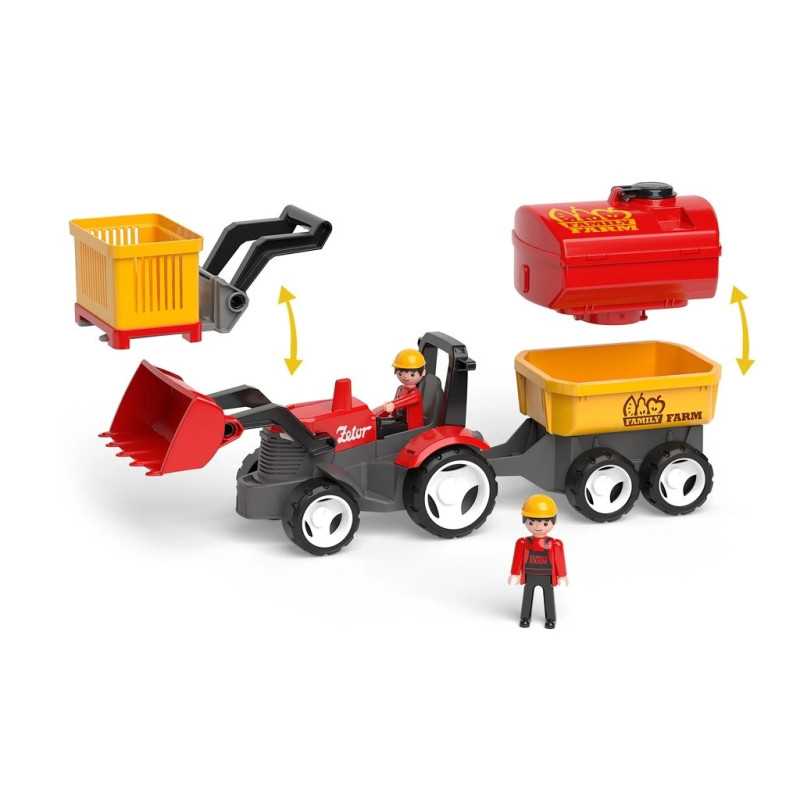 - Traktorius su keičiamu peiliu, krautuvo šakėmis ir padėklu