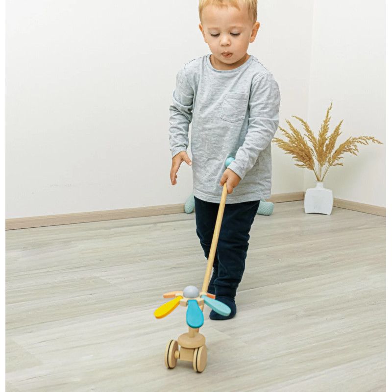 · Tvirta kreipiamoji rankena gale yra medinis rutuliukas, užtikrinantis vaiko saugumą žaidžiant.