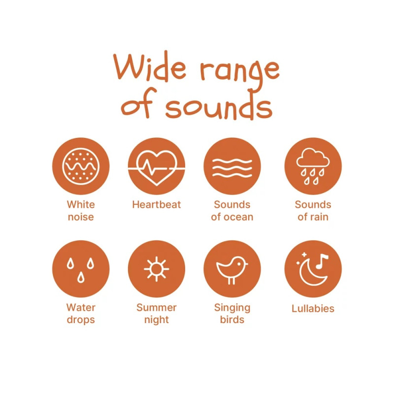 • Muzika ir garsai: baltas triukšmas, širdies plakimas, vandenynas, lietus, paukščių čiulbėjimas, lopšinės